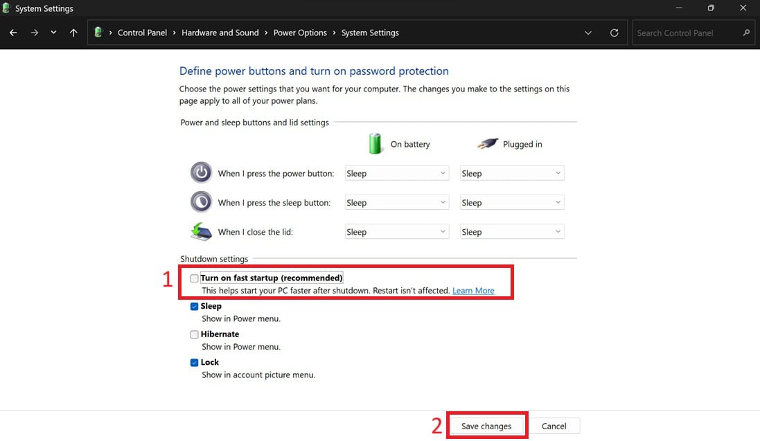 - Désactivez « Turn on fast startup » et cliquez sur « Save changes« .