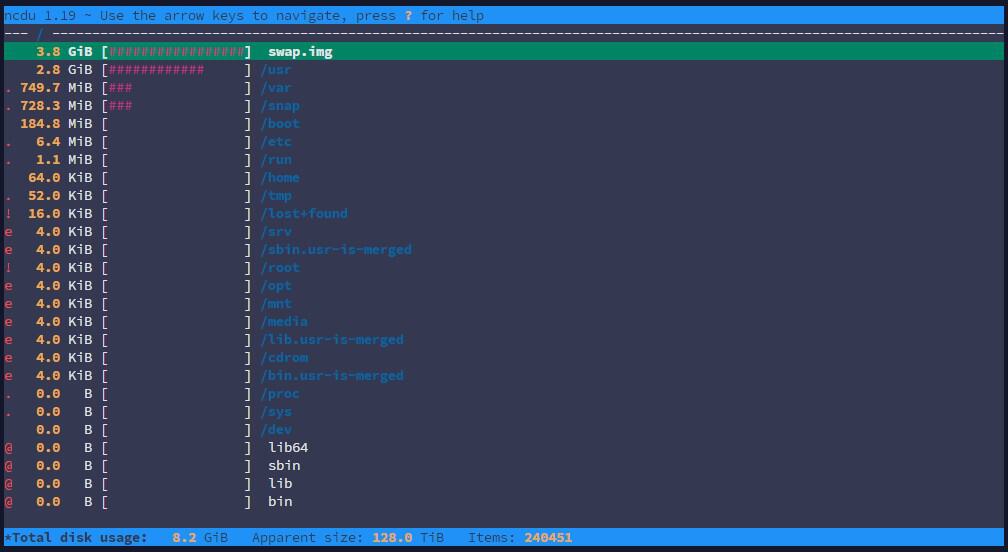 Cependant, nous pouvons utiliser des outils comme ncdu pour surveiller et gérer l’espace disque à partir d’une seule ligne de commande. ncdu vous permet de visualiser vos fichiers ; il affiche une liste triée des plus gros fichiers dans le dossier, et vous pouvez sélectionner et appuyer sur d pour supprimer des fichiers.