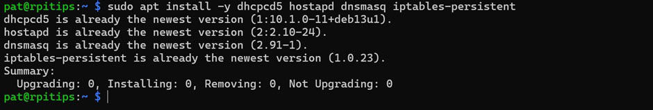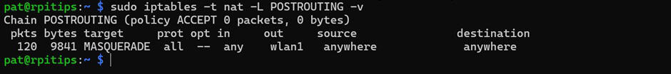 Par conséquent, il configure correctement le point d’accès, mais ne crée jamais de règle NAT/MASQUERADE fonctionnelle pour transférer les paquets du réseau AP vers Internet. Les clients peuvent rejoindre le point d’accès et obtenir une adresse IP, mais leur trafic s’arrête simplement au Raspberry Pi.