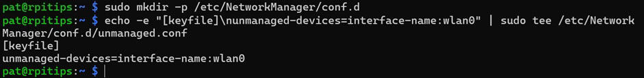 echo -e "[keyfile]\nunmanaged-devices=interface-name:wlan0" | sudo tee /etc/NetworkManager/conf.d/unmanaged.conf