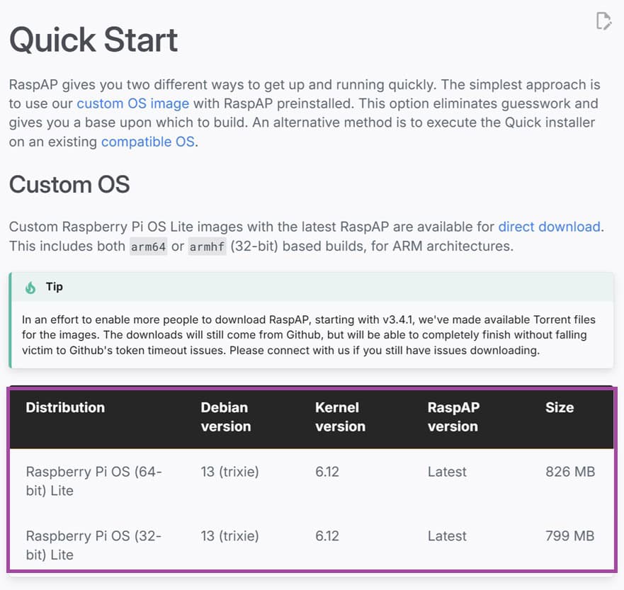 La première chose que nous devons faire est de télécharger la dernière image de RaspAP. Vous pouvez télécharger l’image depuis la page de démarrage rapide du site. Au moment de la rédaction de ce tutoriel, la version la plus récente était basée sur la version 6.12 du noyau Linux.