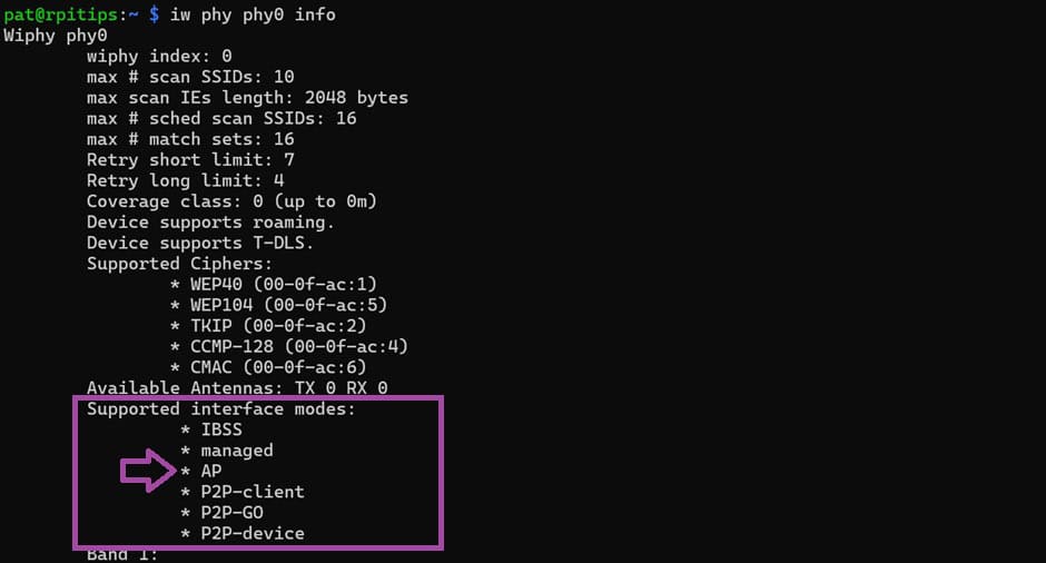 Faites défiler la sortie et vérifiez que le mode AP est listé dans la section « Supported interface modes« .