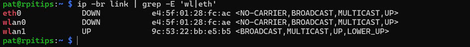 Maintenant, nous devons d’abord comprendre la disposition de notre système. Pour cela, nous devons d’abord comprendre toutes les interfaces disponibles. Nous pouvons voir une liste de toutes les interfaces disponibles en utilisant cette commande :ip -br link | grep -E 'wl|eth'
