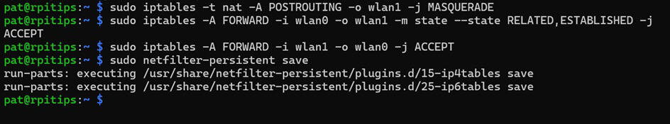 sudo iptables -A FORWARD -i wlan0 -o wlan1 -m state --state RELATED,ESTABLISHED -j ACCEPT