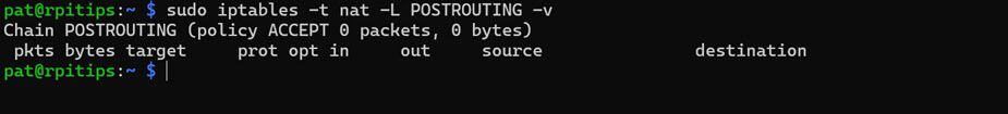 sudo iptables -t nat -L POSTROUTING -v - Si vous voyez une réponse comme celle-ci, alors vos règles NAT ne sont pas configurées correctement :