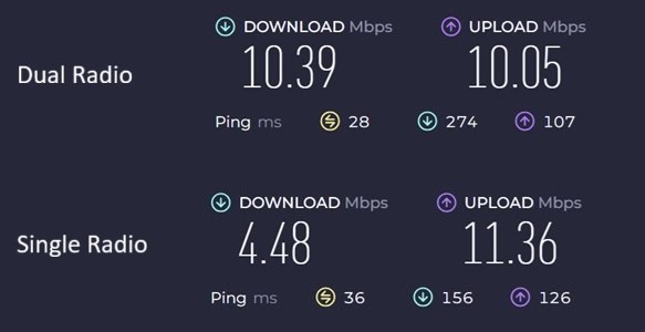 Vous pouvez voir dans les tests de vitesse que j’ai réalisés que le mode Double radio a en moyenne une vitesse de téléchargement deux fois supérieure à celle du mode Radio unique. J’ai utilisé Ookla Speedtest pour cela, en utilisant la même connexion Wi-Fi à domicile et en les plaçant à la même distance.