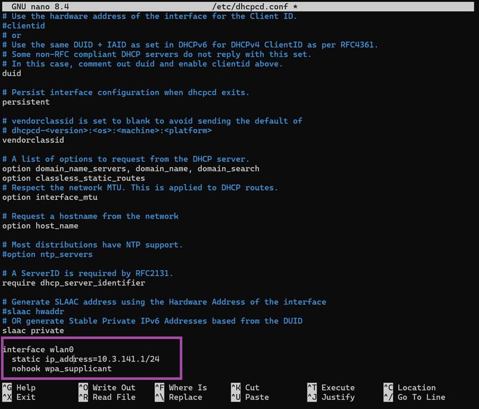 Maintenant, nous pouvons configurer une IP statique pour notre interface wlan0 en éditant le fichier /etc/dhcpcd.conf. Ajoutez ceci en bas de ce fichier (vous pouvez définir l’IP de votre choix).